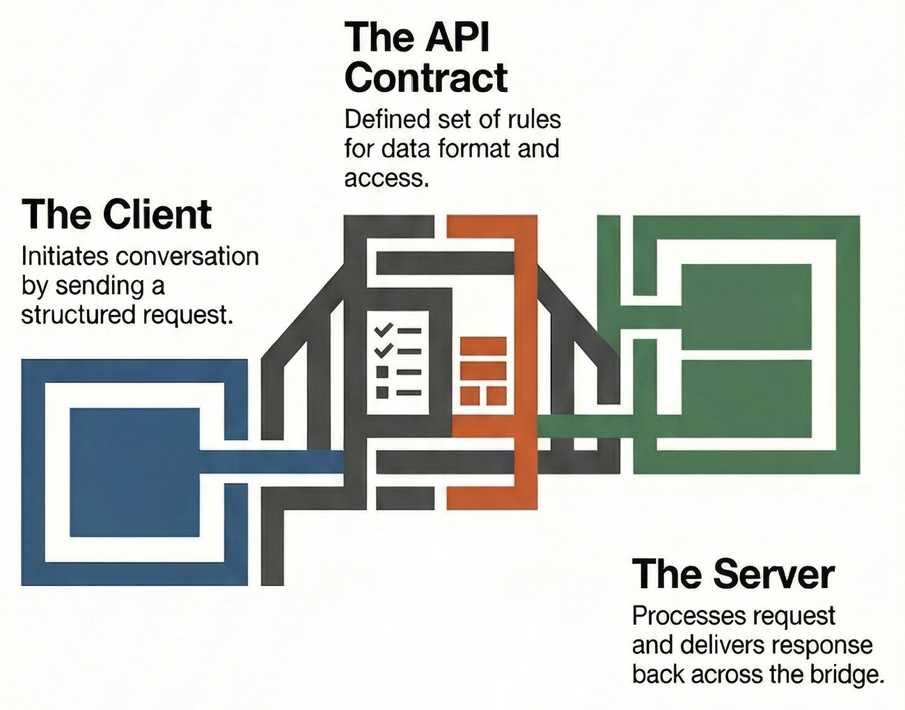 An API is a contract between two programs.1 One program (the client) sends a request. The other (the server) processes it and sends back a response. The API defines exactly how that conversation works: what questions you can ask, what format they need to be in, and what the answers will look like.